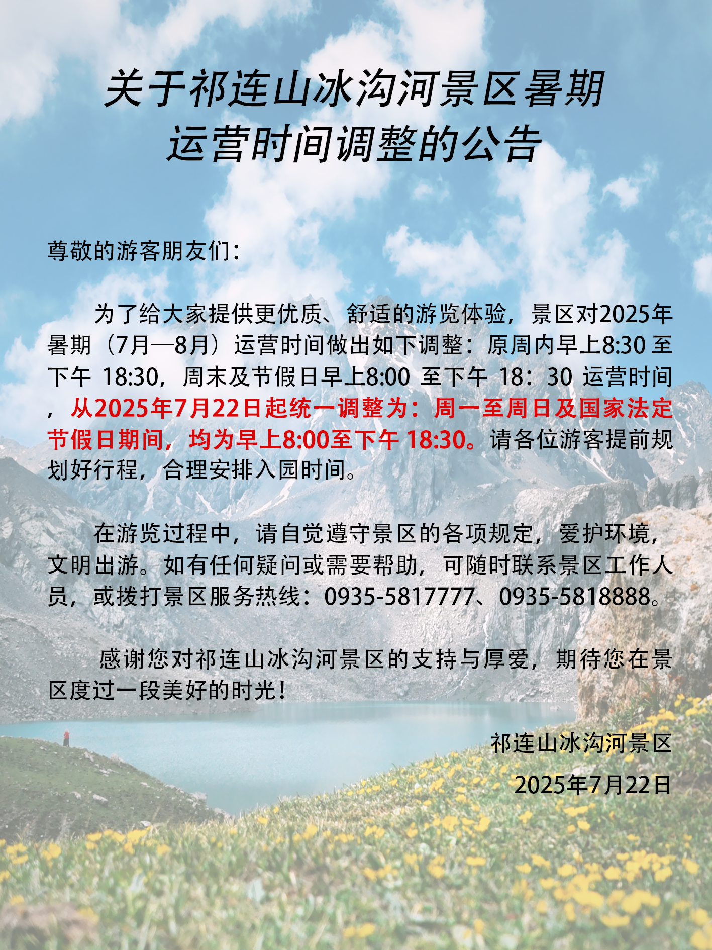 关于祁连山冰沟河景区2025年暑期运营时间调整的公告